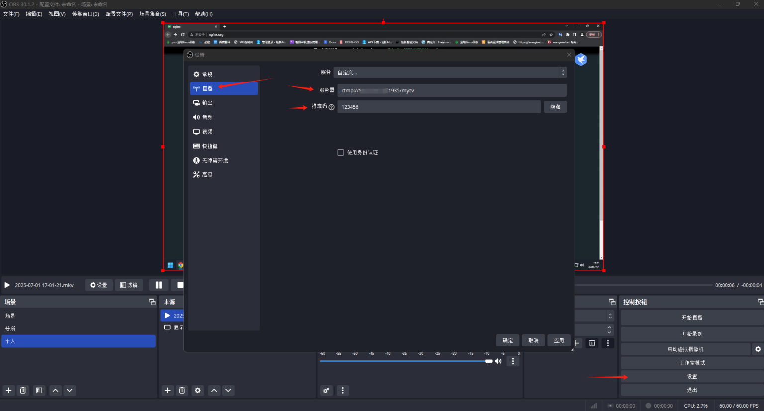 进行OBS推流设置。